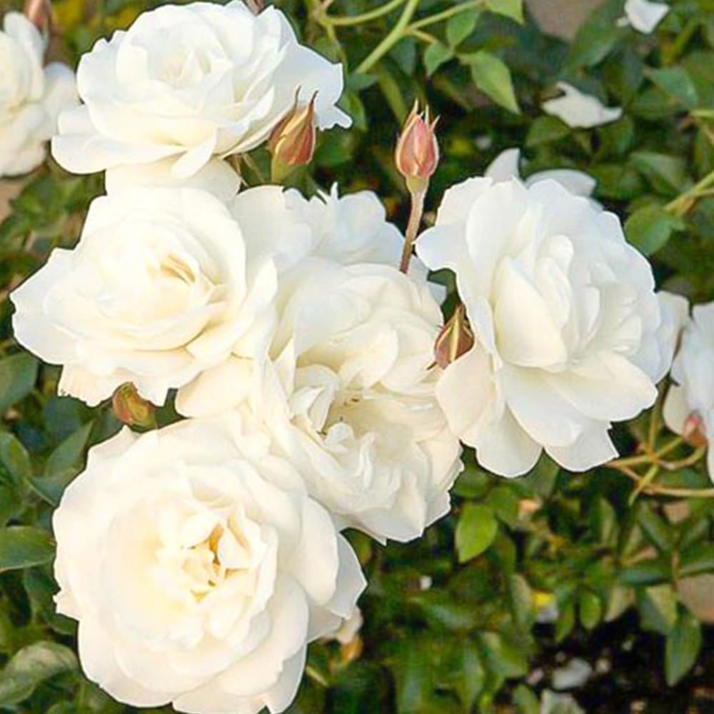 Цвітіння триває з початку літа до осені хвилями. Квіти великі, махрові, ніжно-біло-кремового або світло-перлового відтінку, з приємним, м’яким ароматом. Аромат ненав’язливий, типовий для декоративних троянд. Основні хвилі цвітіння повторюються протягом сезону, забезпечуючи тривалий декоративний ефект у саду.