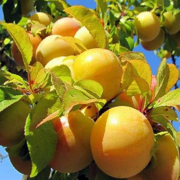 Плоди середнього розміру, округлі або трохи овальні. Шкірка гладка, яскраво-жовта. М’якоть соковита, ніжна, солодка з легкою медовою ноткою. Плоди придатні для свіжого споживання та домашньої переробки. Термін дозрівання — літній. Плодоношення починається на 2–3 рік після посадки за належного догляду.